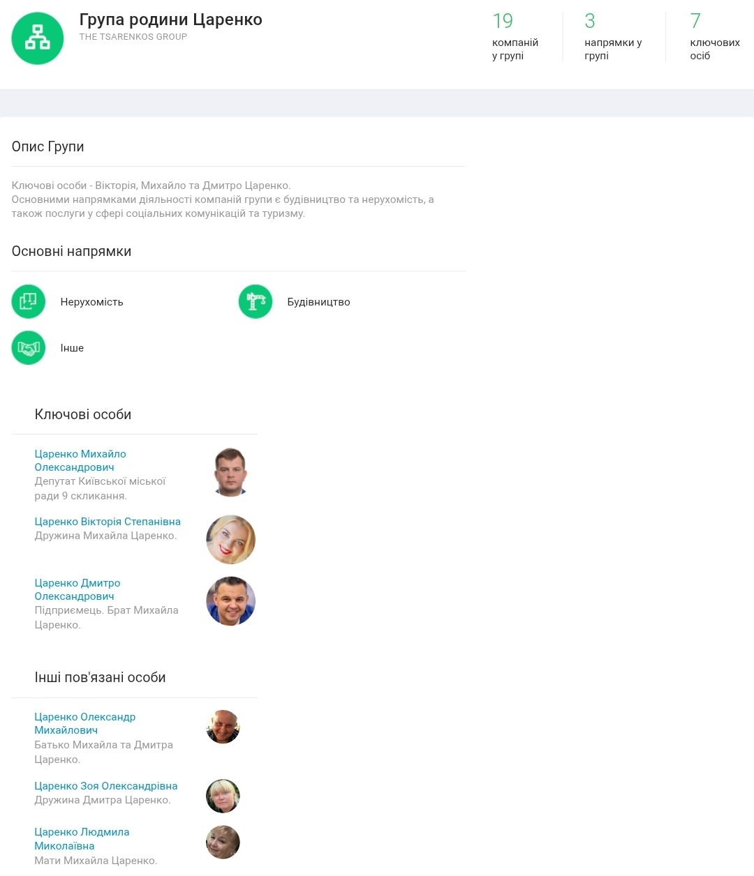 Система Youcontrol відносить до неформальної “групи родини Царенків” близько двох десятків компаній в сфері будівництва, нерухомості, надання послуг у сфері соціальних комунікацій та туризму. Ключовими особами даної групи, крім Михайла та Вікторії Царенків, є Дмитро Царенко, який є братом вищезгаданого депутата міськради.